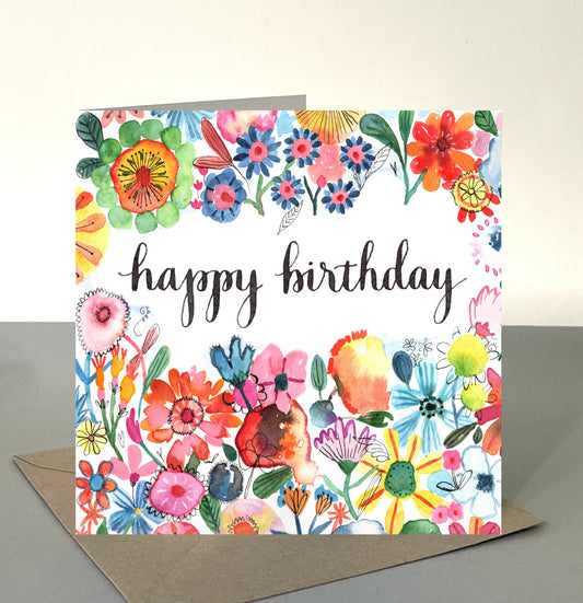 D207. Bright Floral, Bee, Happy Birthday Dinky Greetings Card