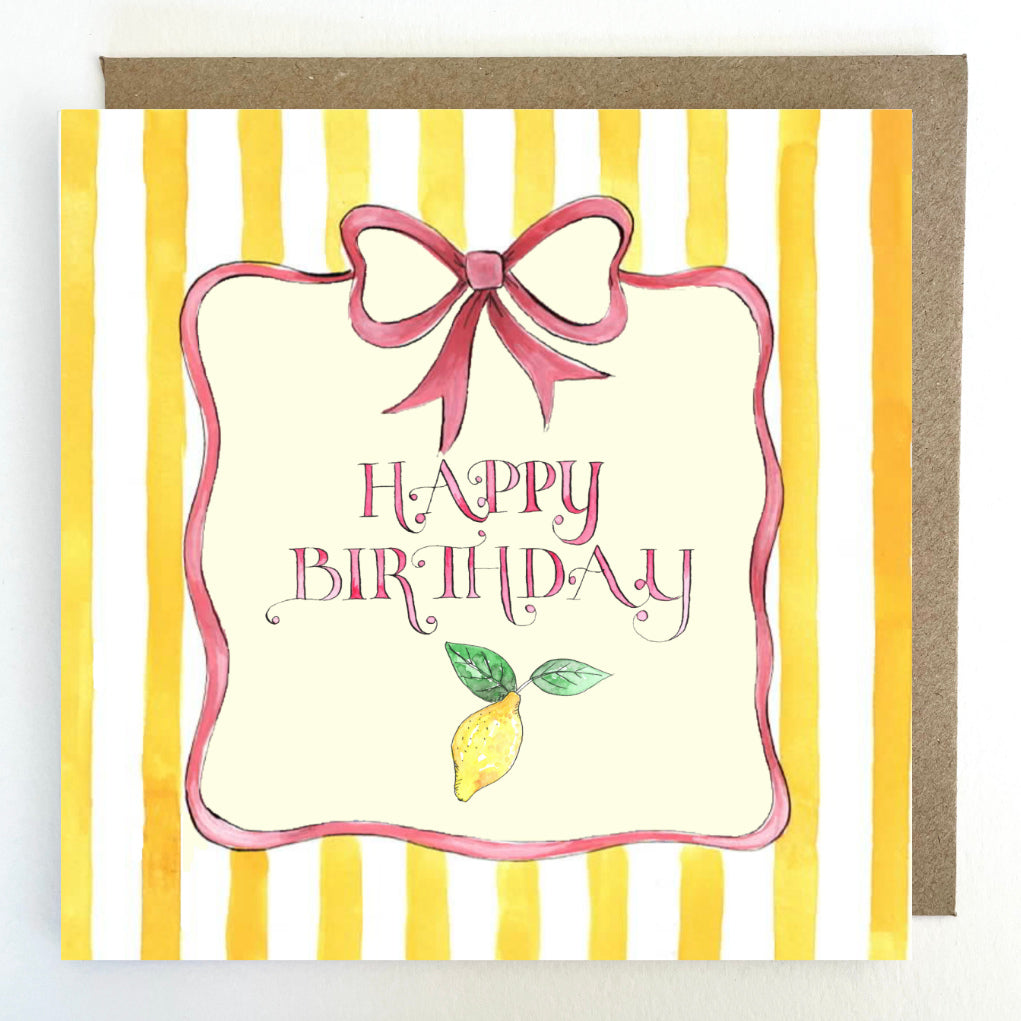 K313. Yellow Stripes, Bow & Lemon Happy Birthday Greetings Card